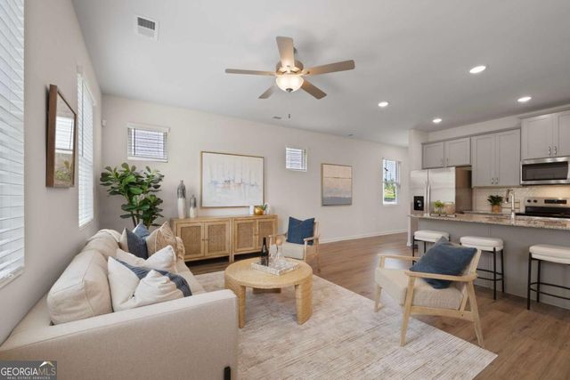 Welcome to the stunning Charleston "D" floorplan-this beautifully designed home offers a modern, open-concept layout with high-end finishes and thoughtful upgrades throughout. Featuring 3 bedrooms and 2.5 bathrooms, this spacious layout provides both comfort and functionality. The gourmet kitchen is a chef's dream, equipped with 42" cabinets with crown molding, granite countertops, and stainless steel appliances including a range, microwave, and dishwasher. Large windows throughout the home fill the space with natural light, creating a warm and inviting atmosphere. A unique lookout window on the front door adds charm and extra functionality. Upstairs, the Owner's Suite boasts tray ceilings, a private bath with a separate shower and soaking tub, and a walk-in closet. It is accompanied by two generously sized secondary bedrooms and a full bathroom. Located in The Retreat at Walden Park, residents enjoy resort-style amenities including a swimming pool, cabana, playground, and dog park. The community is conveniently located near shopping, dining, and major highways (I-75 & I-285), making commuting easy. Renderings may differ from the actual finished product.
